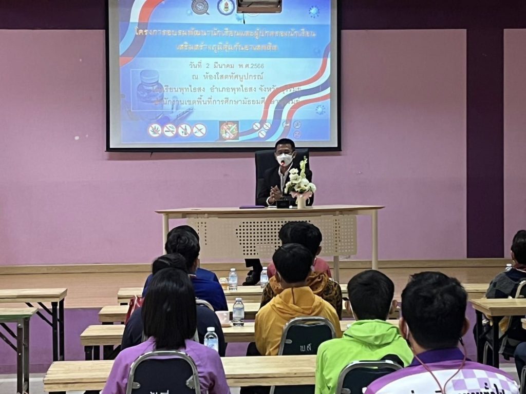 2 มีนาคม 2566 เวลา 08.00 น.-12.00 น. พ.ต.อ.สมยศ พื้นชัยภูมิ ผกก.สภ.พุทไธสง พร้อมด้วย นายภูวนาถ ยุพานวิทย์ ผู้อำนวยการโรงเรียนพุทไธสง, พ.ต.ท.พิพร รักมงคลตระกูล รอง ผกก.สส.สภ.พุทไธสง, นายชาญ สิ่วไธสง รอง ผู้อำนวยการโรงเรียนพุทไธสง, นางวรัชนก เสโส ผู้อำนวยการโรงพยาบาลส่งเสริมสุขภาพตำบลบ้านเพียแก้ว เจ้าหน้าที่ตำรวจชุดสืบสวน สภ.พุทไธสง ข้าราชการครูฝ่ายปกครองโรงเรียนพุทไธสง จัดอบรม”โครงการพัฒนานักเรียน และผู้ปกครองนักเรียนเพื่อเสริมสร้างภูมิคุ้มกันด้านยาเสพติด” โดยมีนักเรียน ผู้ปกครองนักเรียน คณะครูโรงเรียนพุทไธสง เข้าร่วมโครงการ มีการบรรยายพิเศษเกี่ยวกับยาเสพติด โทษ และพิษภัยจากยาเสพติด กฎหมายเกี่ยวกับยาเสพติด วิธีการปฏิเสธ การป้องกัน ณ ห้องโสตทัศนศึกษา 2 โรงเรียนพุทไธสง อ.พุทไธสง จว.บุรีรัมย์